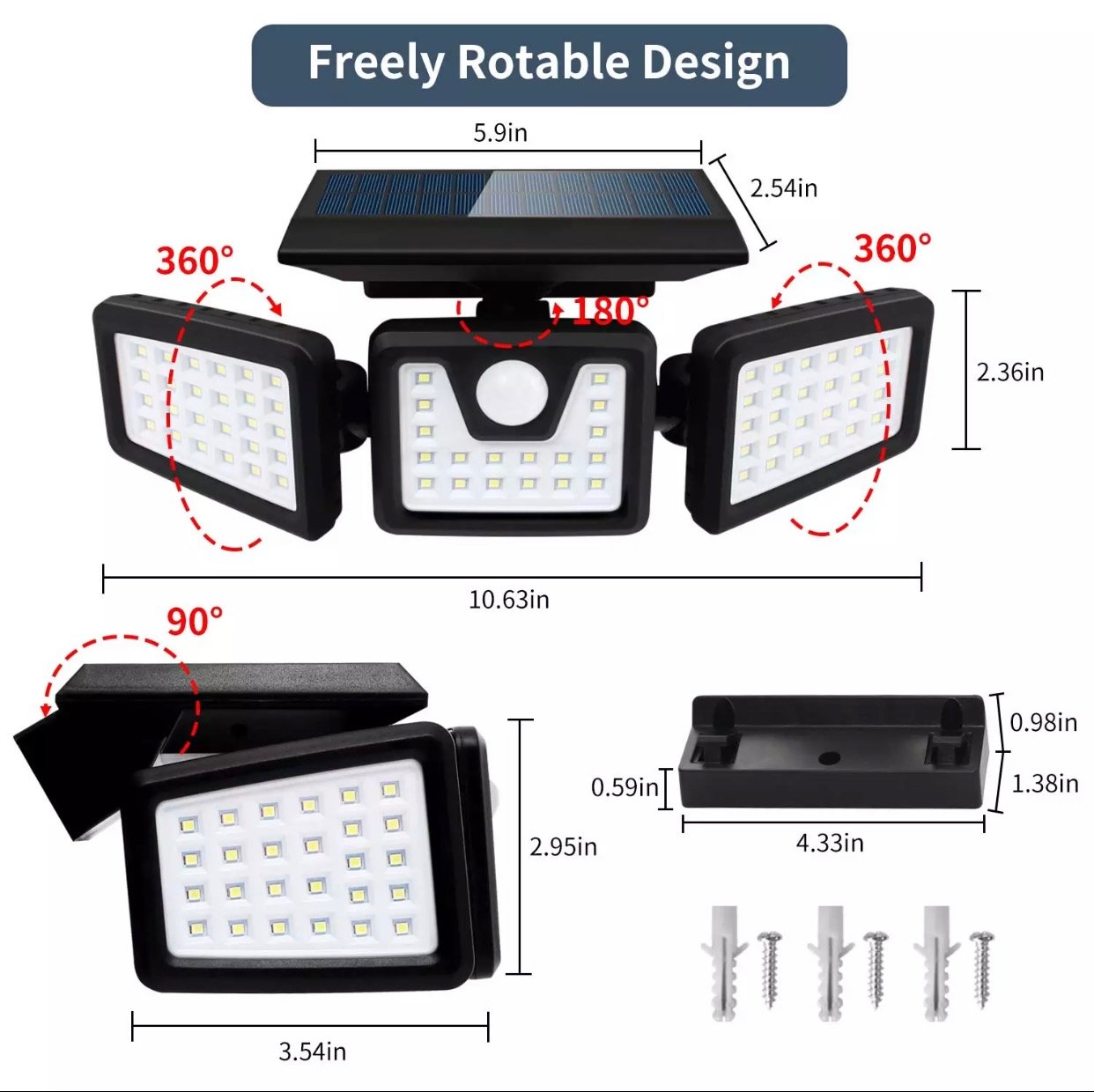 The Solar Motion Sensor LED Security Light provides bright and energy-efficient outdoor lighting. It features 3 adjustable LED heads, a built-in motion sensor, and a solar panel that charges during the day and automatically lights up at night when motion is detected.