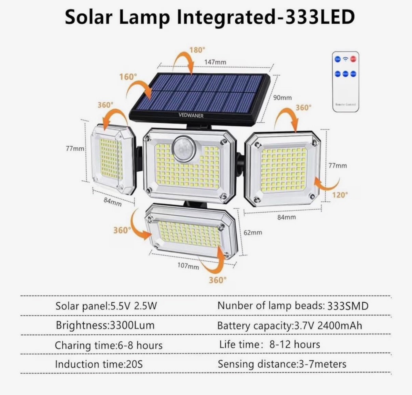 Powered by a separate solar panel, it charges during the day and works automatically at night, saving energy and electricity costs. Its waterproof and durable design makes it suitable for all weather conditions, while the easy installation allows you to mount it quickly on any wall or outdoor area.